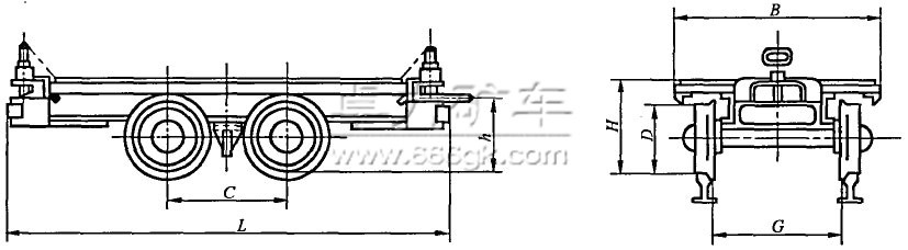 | 型號(hào) | 裝載 量/t | 軌距G | 外型尺寸 | 軸距 C | 輪徑 D | 牽引 高度 h | 允許 牽引 力/kN | 最小平 面運(yùn)行 半徑 m |